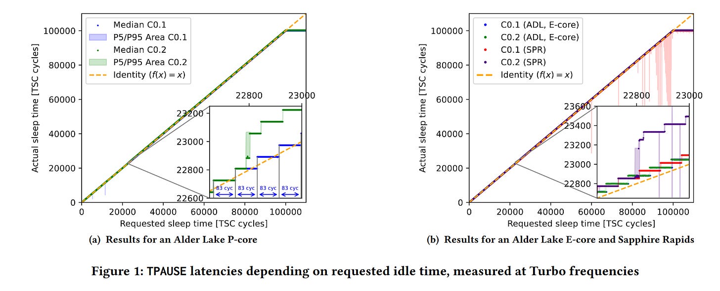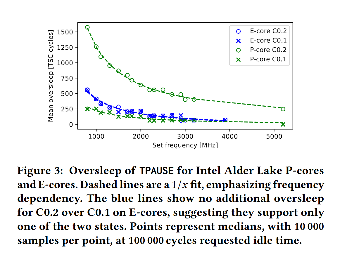 Times are measured in timestamp counter cycles (roughly 3 GHz for Alder Lake). The plateau at the top right is caused by the OS-specified maximum timeout. The authors find that timeout values are quantized (e.g., 83 cycles on Alder Lake P-core). Additionally, for short timeouts the processor may ignore the user-requested power state (presumably because it doesn’t make sense to enter a deep sleep for a short amount of time). On Alder Lake P-cores, the threshold below which the processor will not enter the lowest power state is around 23,000 TSC cycles. Alder Lake E-cores seem to only support one low power state.