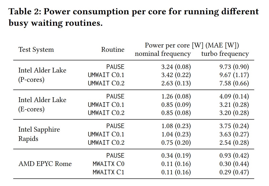And finally, table 2 shows measured power consumption for these new instructions vs old-fashioned busy wait loops that uses the PAUSE instruction (which does not support a user-specified timeout):