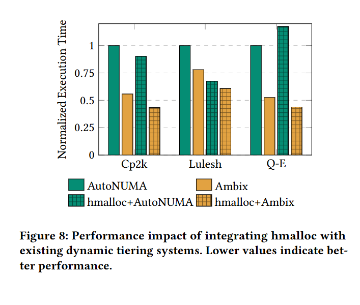 Fig. 8 shows execution time for three benchmarks. hmalloc+Ambix represents the user and kernel solutions described by this paper.