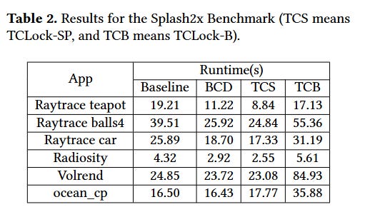 The paper has impressive results from microbenchmarks, but I think real applications are more relevant. Table 2 shows performance results for a few applications and a few locking strategies. BCD is the work in this paper. TCS and TCB are prior work which have the drawback of not being compatible with existing binaries.
