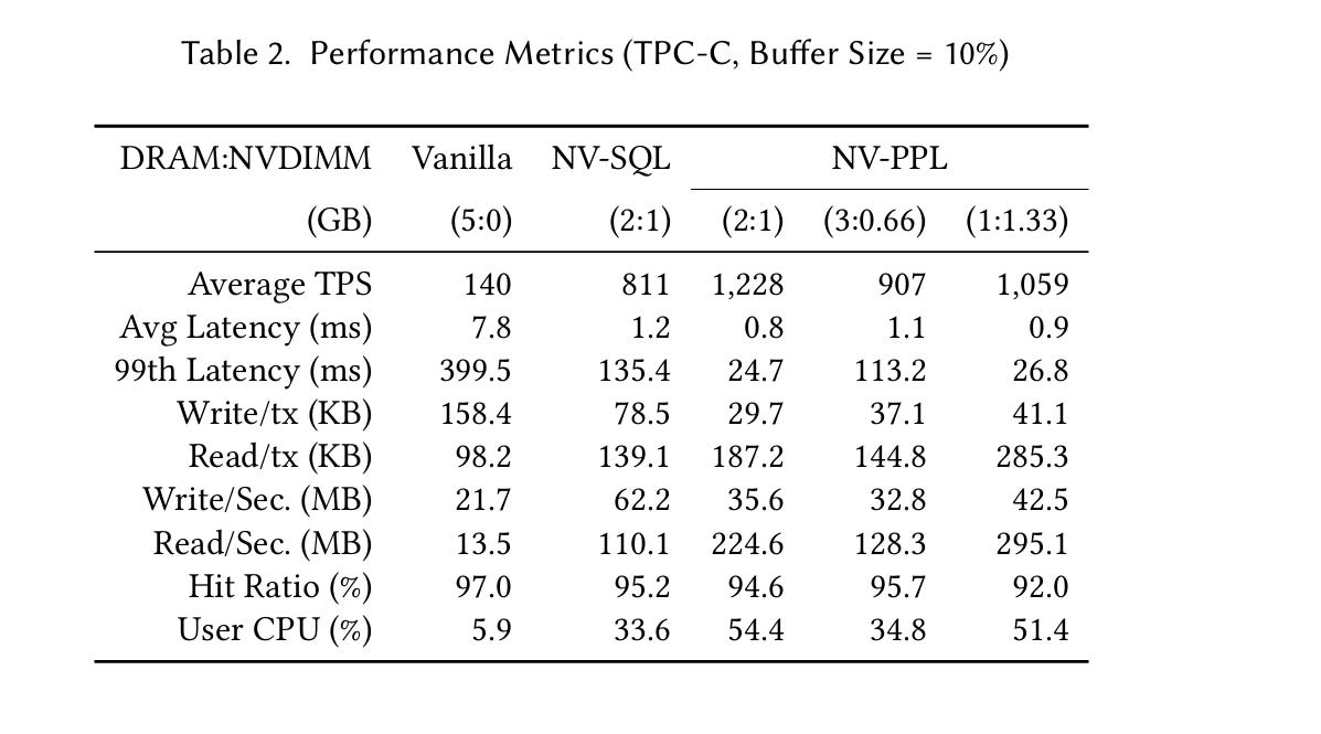 In the following table, NV-SQL represents MySQL running entirely on top of NVDIMM rather than SSD. NV-PPL is this work. The 2:1 column is the most relevant.