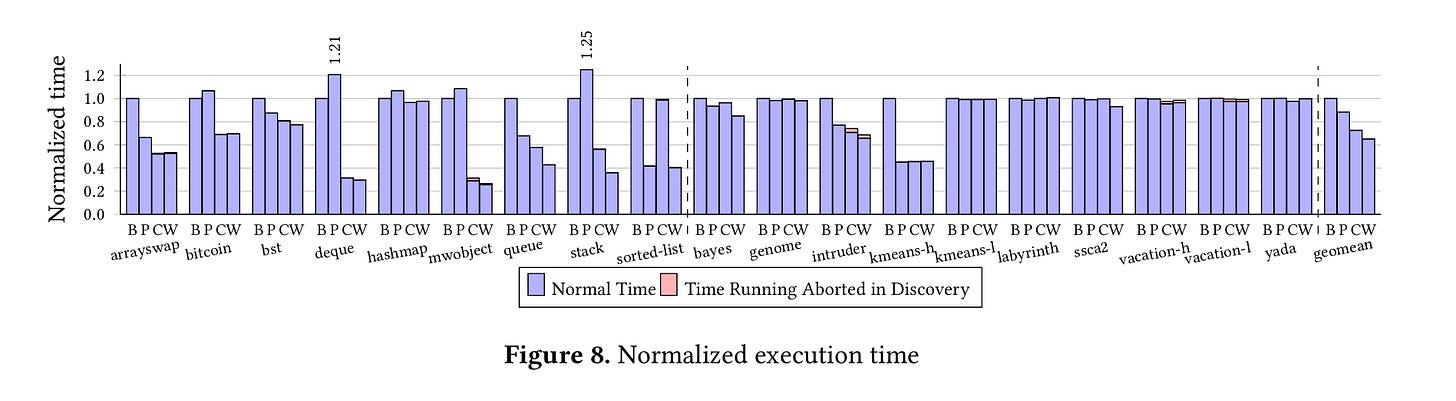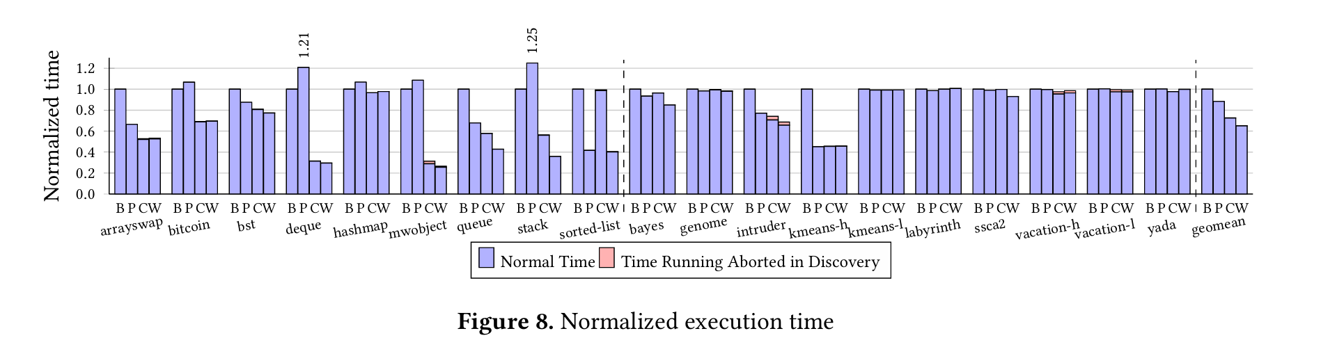 Fig. 8 has the headline results. B is a simplistic implementation of HTM (requester-wins). P is a more advanced implementation of HTM (PowerTM). C is CLEAR built on top of the requester-wins HTM design. PW is CLEAR built on top of the PowerTM implementation of HTM.