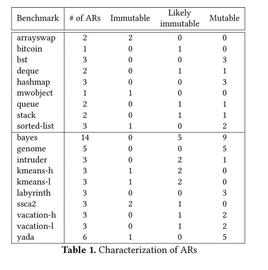Table 1 shows statistics for each atomic region in a set of benchmarks analyzed by the paper: