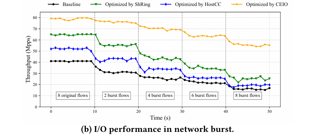The authors implemented CEIO on a BlueField-3 NIC. Fig. 9(a) compares throughput and LLC miss rates of CEIO with other implementations. This particular comparison represents static network conditions (no new flows coming and going, skew properties not changing).