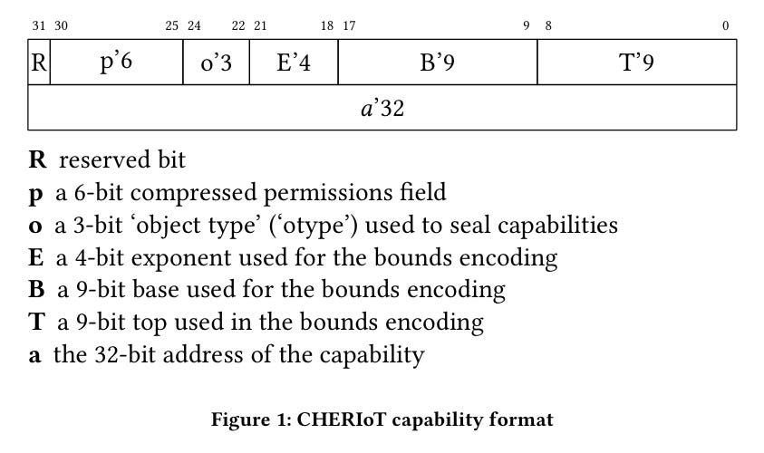 The C in CHERI stands for capability. A capability is a fat pointer which contains an address, bounds, and access permissions. Fig. 1 shows the bit layout (64 bits total) of the capabilities used by CHERIoT:
