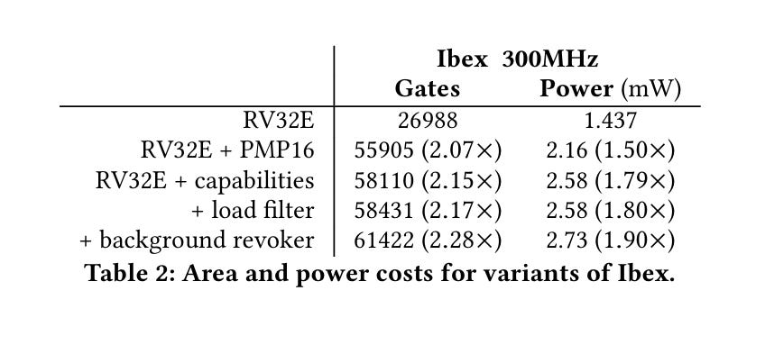 Table 2 shows the area and power cost associated with extending the Ibex processor to support CHERIoT (roughly 2x for both metrics):
