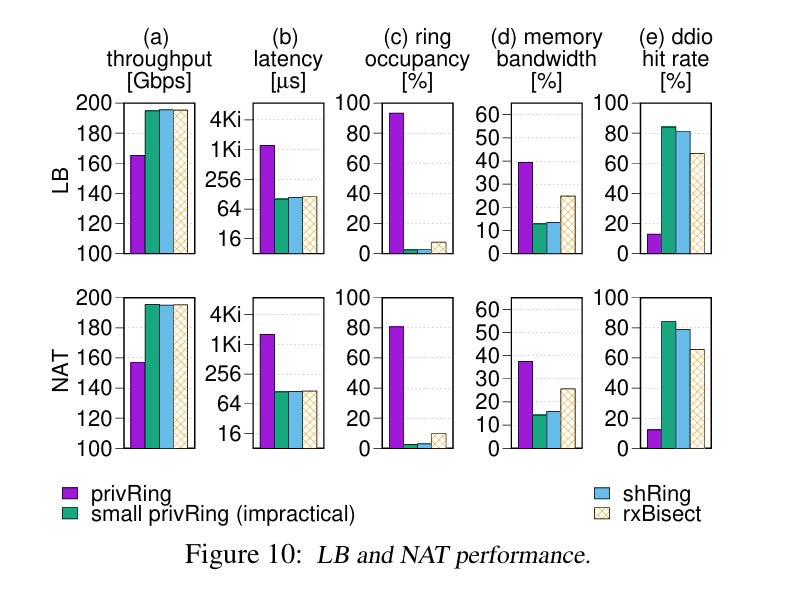 Fig. 10 has some great data. privRing is a baseline with large per-core rings, it suffers from leaky DMA. small privRing is a baseline with small per-core rings, it suffers from packet drops during bursts (not seen in this figure). shRing is prior work from the same authors, and rxBisect is the work in this paper.