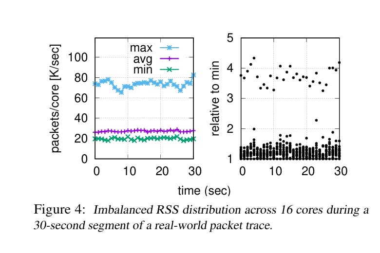 If the receive ring for any particular core is too small, and a burst of packets arrive for that core, then NIC will produce data faster than that core can consume it, and the NIC will be forced to drop packets. Fig. 4 presents evidence that this situation does occur in real life: