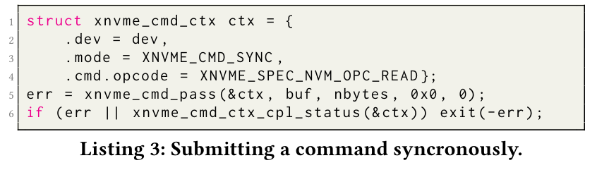 The C API will feel like home for folks who have experience with low-level graphics APIs (no shaders on the disk yet, sorry). There are APIs to open a handle to a device, allocate buffers, and submit NVMe commands (synchronously or asynchronously). Listing 3 has an example, which feels like “Mantle for NVMe”: