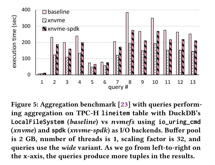 Most of the results in the paper show comparable performance for xNVMe vs the baseline DuckDB filesystem. Fig. 5 shows one benchmark where xNVMe yields a significant improvement: