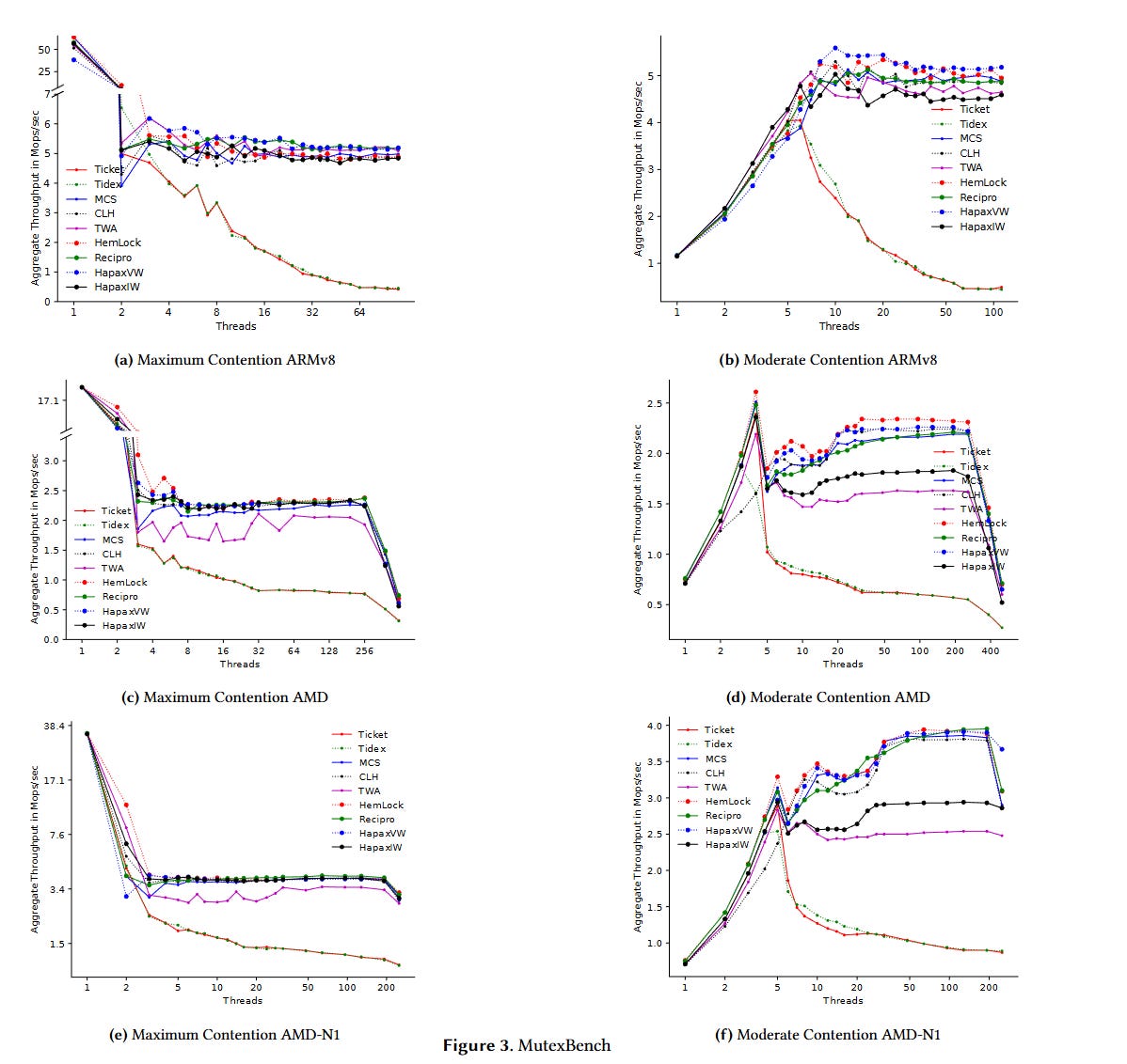 Fig. 3 has results from a microbenchmark. Hapax locks scale much better than ticket locks and go head-to-head with other state-of-the-art locking algorithms. The Hapax implementation is so concise (about 100 lines) that the authors included C++ source code in the paper.