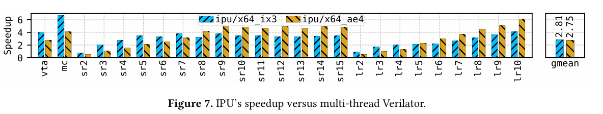 The Graphcore IPU used in this paper is a chip with 1472 cores, operating with a MIMD architecture. A 1U server can contain 4 IPUs. It is interesting to see a chip that was designed for DNN workloads adapted to the domain of RTL simulation.