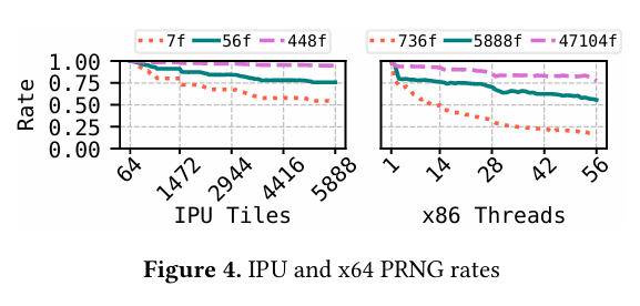 Fig. 4 has a fascinating comparison of synchronization costs between an IPU and a traditional x64 CPU. This microbenchmark loads up the system with simple fibers (roughly 6 instructions per fiber). Note that the curves represent different fiber counts (e.g., the red dotted line represents 7 fibers on the IPU graph, vs 736 fibers on the x64 graph). The paper claims that a barrier between 56 x64 threads implemented with atomic memory accesses consumes thousands of cycles, whereas the IPU has dedicated hardware barrier support.