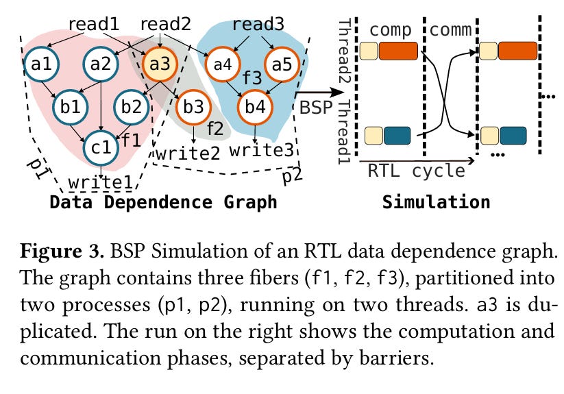 Similar to other papers on RTL simulation, a fundamental step of the Parendi simulator is partitioning the circuit to be simulated. Parendi partitions the circuit into fibers. A fiber comprises a single (word-wide) register, and all of the combinational logic which feeds it. Note that some combinational logic may be present in multiple fibers. Fig. 3 contains an example, node a3 is present in multiple fibers. As far as I can tell, Parendi does not try to deduplicate this work (extra computation to save synchronization).