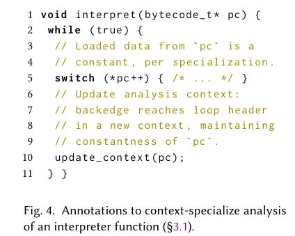 In this usage, a (basic block, context) pair is really a (basic block, operation in the interpreted program) pair. This means the body of the interpreter’s while loop will be replica once for each operation in the interpreted program. At each replica, the value of pc will be known by the compiler/specializer.