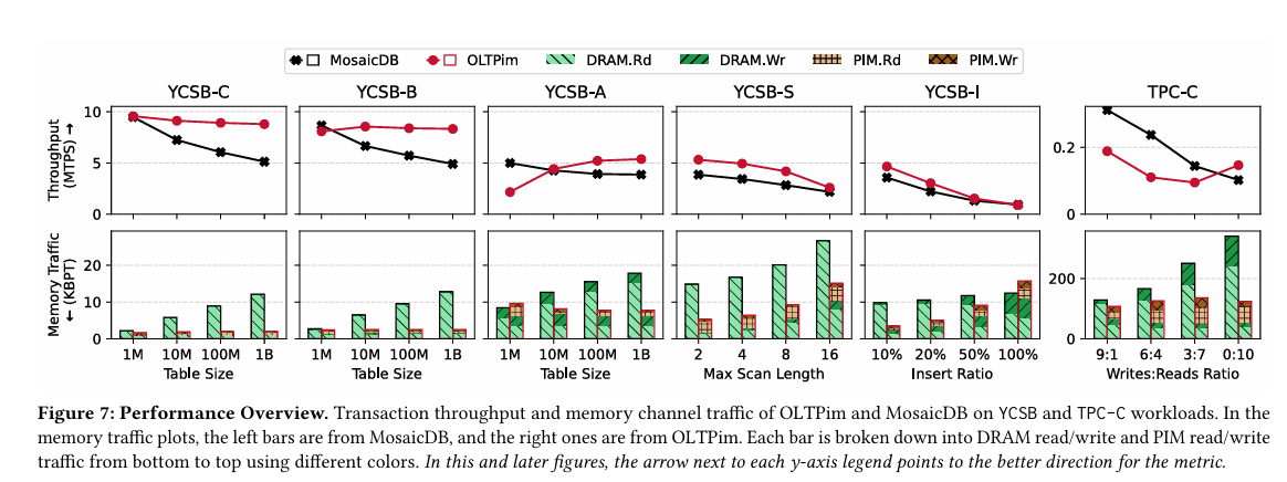 Fig. 7 has the headline results. MosaicDB is the baseline, OLTPim is the work described by this paper. It is interesting that OLTPim only beats MosaicDB on TPC-C for read-only workloads.