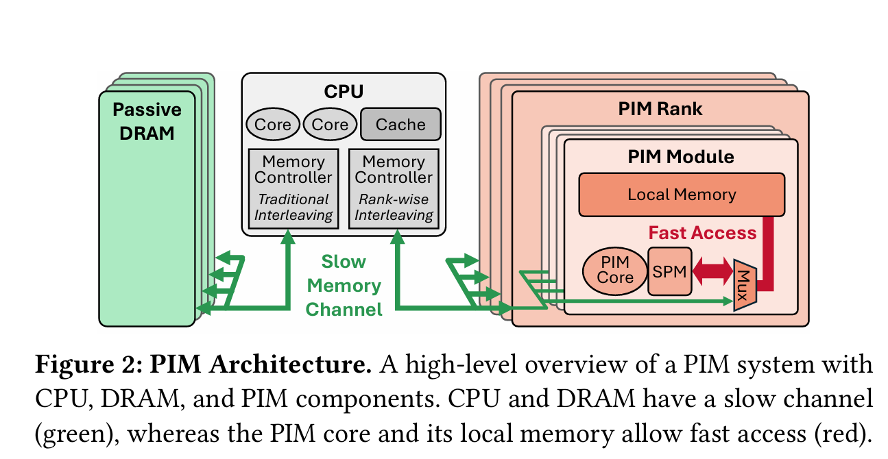 Fig. 2 illustrates the system architecture used by this paper. A traditional CPU is connected to a set of boring old DRAM DIMMs and is also connected to a set of UPMEM DIMMs.