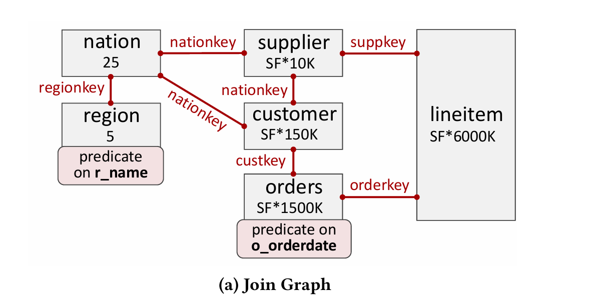 First, construct a join graph. Each vertex is a table (i.e., relation) and each edge is a join key (Fig. 1a):
