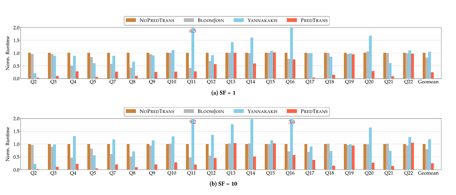 But what if you are doing something more complex than a join of two tables (e.g., TPC-H Q5)? This is where predicate transfer comes to the rescue. It is a straightforward algorithm that propagates information between all tables involved in a join, thus increasing the number of rows that can be removed early.