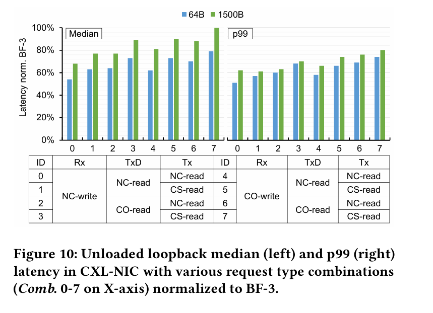 CXL Type-2 NICs allow packets and descriptors to be stored in NIC memory. The host CPU can cache data read from the NIC, as the NIC will generate the necessary coherence traffic when it reads or writes this data. The design space (what data goes into what memory) is large, and the results section has numbers for many possible configurations.