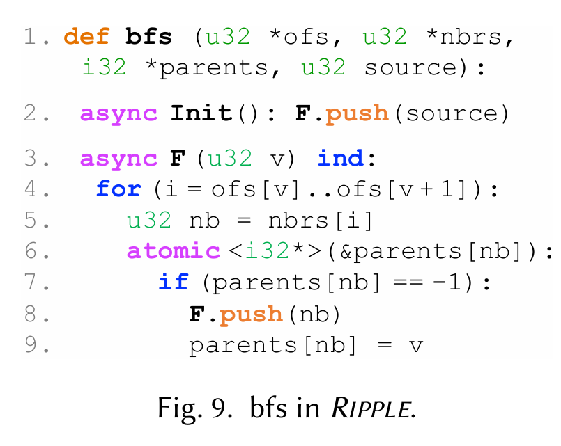 Fig. 9 shows breadth first search implemented in Ripple. Note how Init and F both have the async keyword (callers do not wait for a “call” to complete). Line 8 contains an example “call” to F (which happens to be recursive). The push keyword makes it pretty clear at the call site that this is a “fire and forget” operation.