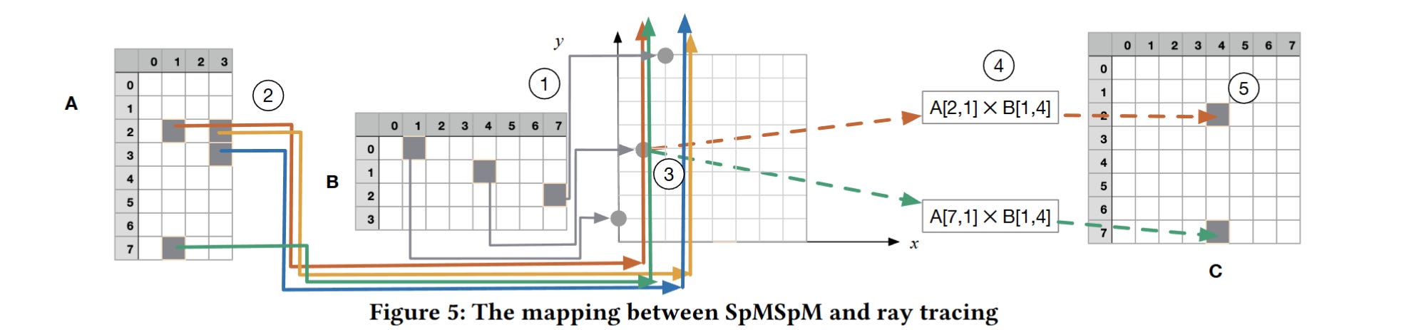 In fig. 5 the coordinates of the non-zero cells in matrix A are: [(2, 1) (2, 3) (3, 3) (7, 1)]. The figure shows rays overlaid on top of the result matrix, but I find it easier to think of the rays traced through matrix B.