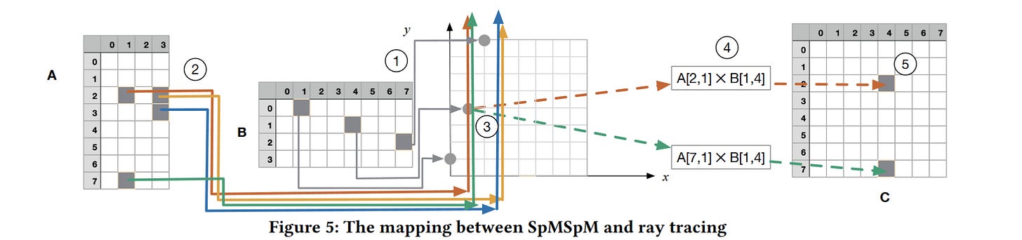 The ray corresponding to the cell in A at (2, 1) has a column index of 1, so the algorithm traces a ray horizontally through B at row 1. The ray tracing hardware will find that this ray intersects with the cell from B at coordinate (1, 4). So, these cells are multiplied together to determine their contribution to the result.