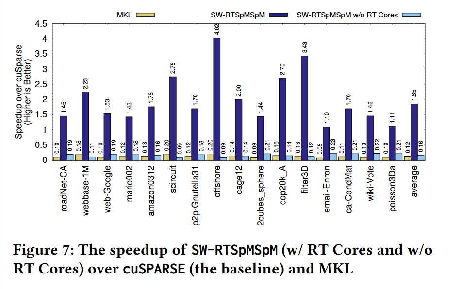 Fig. 7 has benchmark results. All results are normalized to the performance of the cuSPARSE library (i.e., values greater than one represent a speedup). MKL corresponds to the Intel MKL library running on a Core i7 14700K processor. The “w/o RT cores” bars show results from the same algorithm with ray tracing implemented in general CUDA code rather than using the ray tracing accelerators.