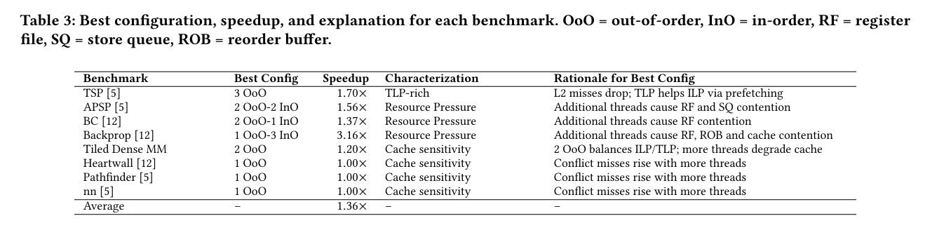 If you are like me, when you read that, you thought “if an application has a bunch of parallel work, then shouldn’t it just use the InO threads?” The answer is “no”. The key point is that OoO can do better for some parallelizable workloads, for example: because it does not require N times the working set in caches.