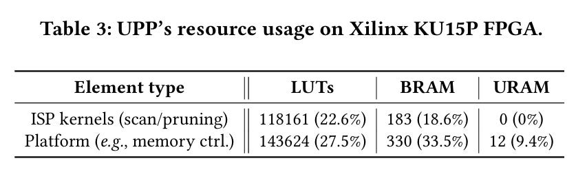 Table 3 shows FPGA resource usage numbers for an FPGA accelerator which executes queries by performing bitwise operations on row and query vectors, and compacting tables based on the generated bitmaps. These numbers seem pretty modest (i.e., good) to me. The authors argue that this implementation is small enough that it could be incorporated into a Smart SSD, allowing queries to be pushed down as far as possible.