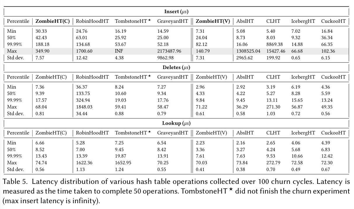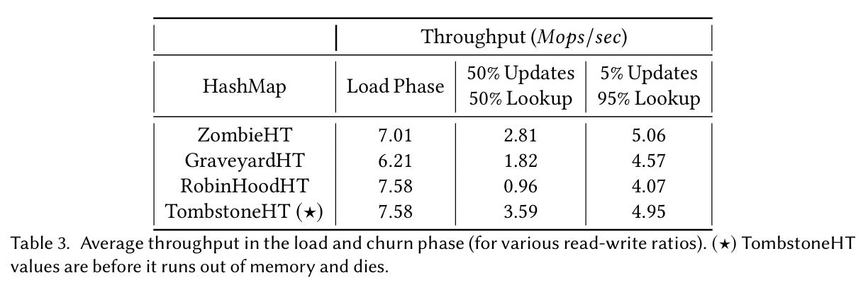 Table 3 contains throughput results, ZombieHT is the algorithm described in this paper. This algorithm shines for update-heavy workloads.
